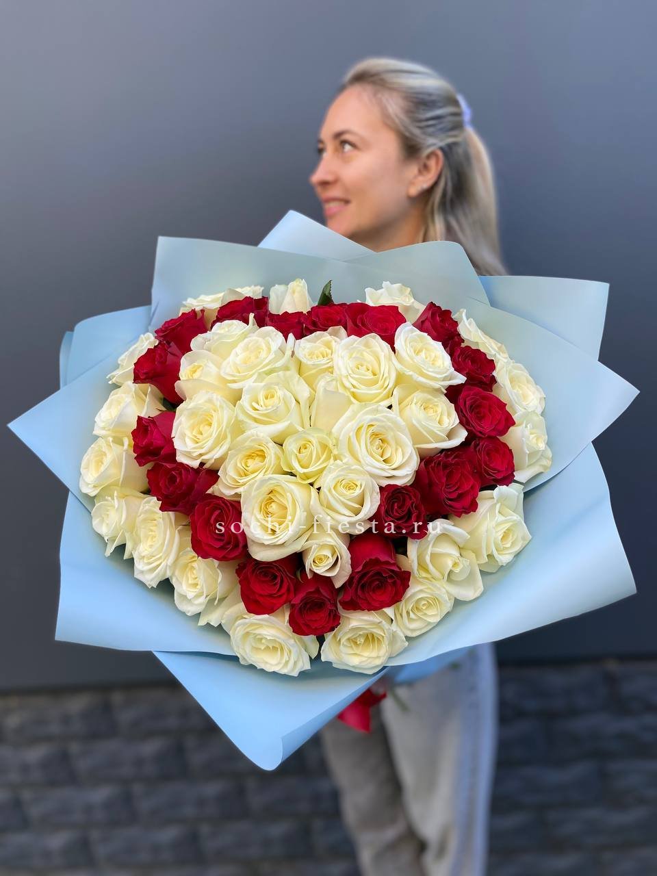 Пятьдесят один бутон выложен в форме сердца — геометрия чувств в живом исполнении. Авторская работа с силуэтом превращает классические розы в объёмную романтичную композицию.