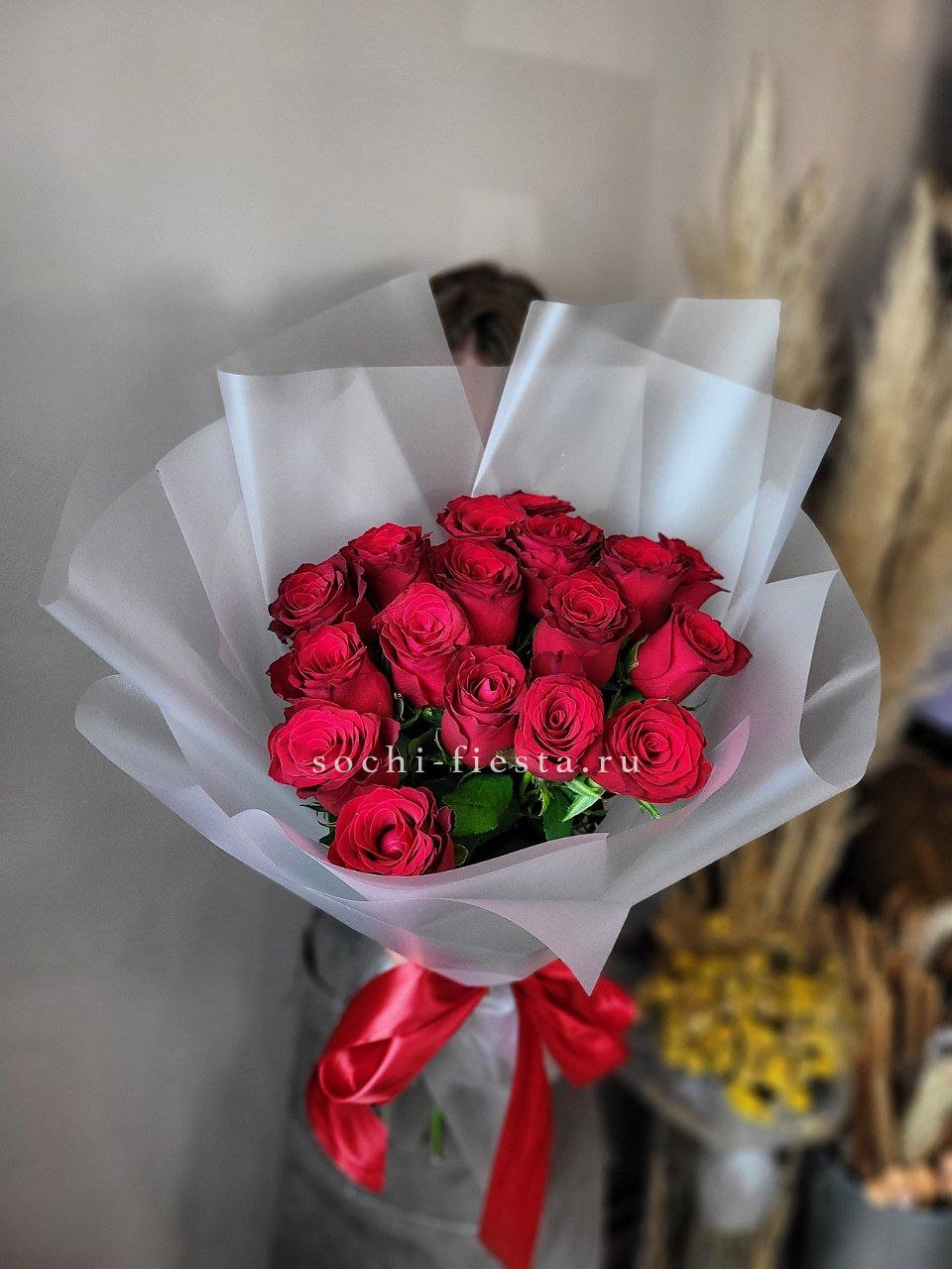 Семнадцать красных роз в обрамлении крафта или дизайнерской пленки — это лаконичная форма с выраженным характером. Букет удобен для вручения и долго радует свежестью.