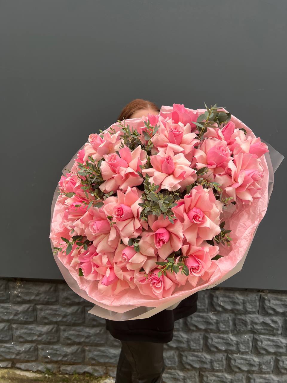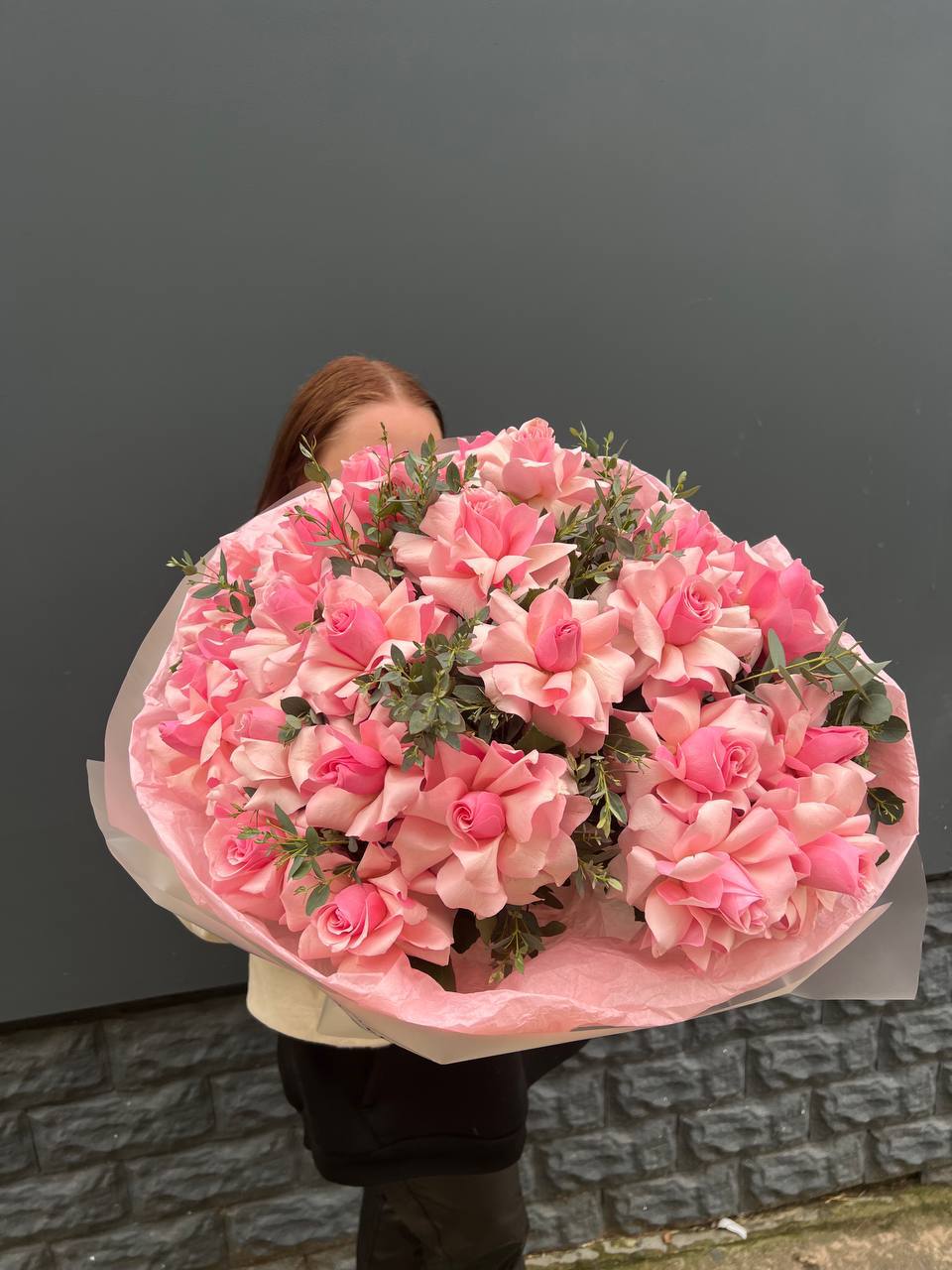 Сто одна роза пудрово-розового оттенка образует монохромное облако из бутонов. Классическая форма в современной подаче для тех, кто предпочитает говорить цветом без лишних слов.