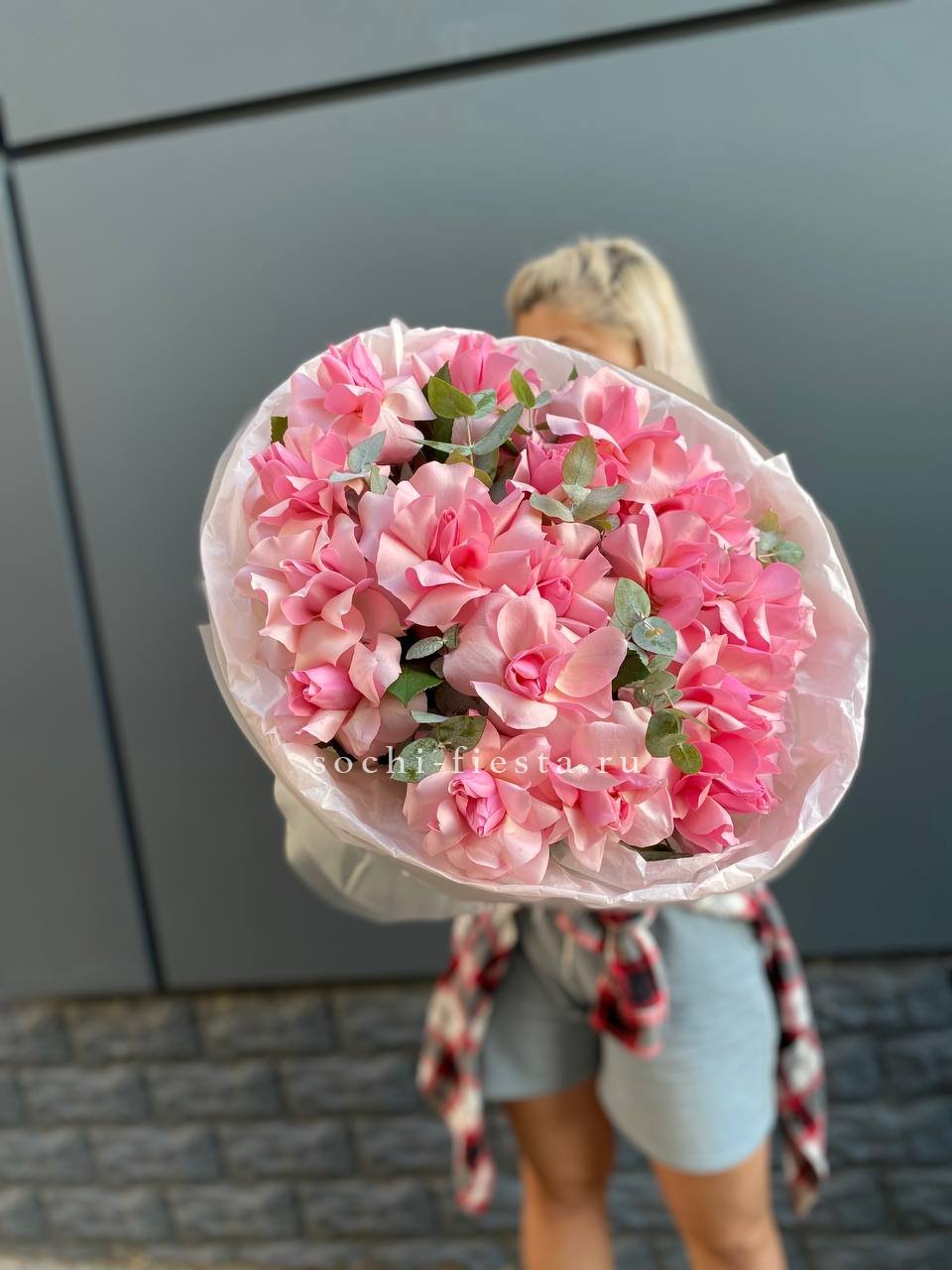 Двадцать пять бутонов с бархатистыми лепестками собраны в округлую форму, которая держит объём и создаёт мягкое розовое облако. Такой букет легко размещается в вазе и сохраняет свежесть долгое время.