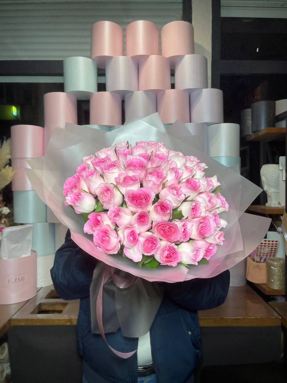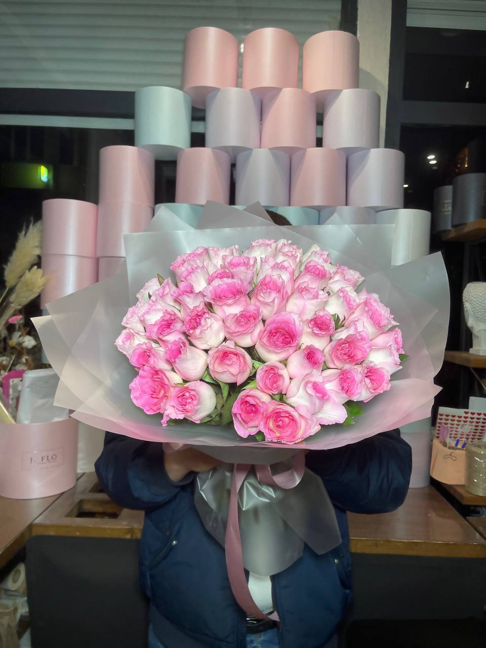 Розовые бутоны собраны в воздушную композицию с комбинированной упаковкой. Тишью добавляет фактурности, а количество цветов можно выбрать под настроение момента и масштаб события.