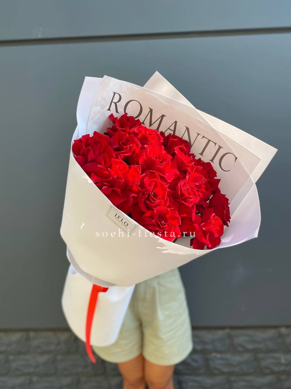 Девятнадцать красных роз с ажурной фактурой лепестков раскрываются постепенно, обнажая глубину каждого бутона. Фоамиран добавляет мягкости силуэту и завершает форму.