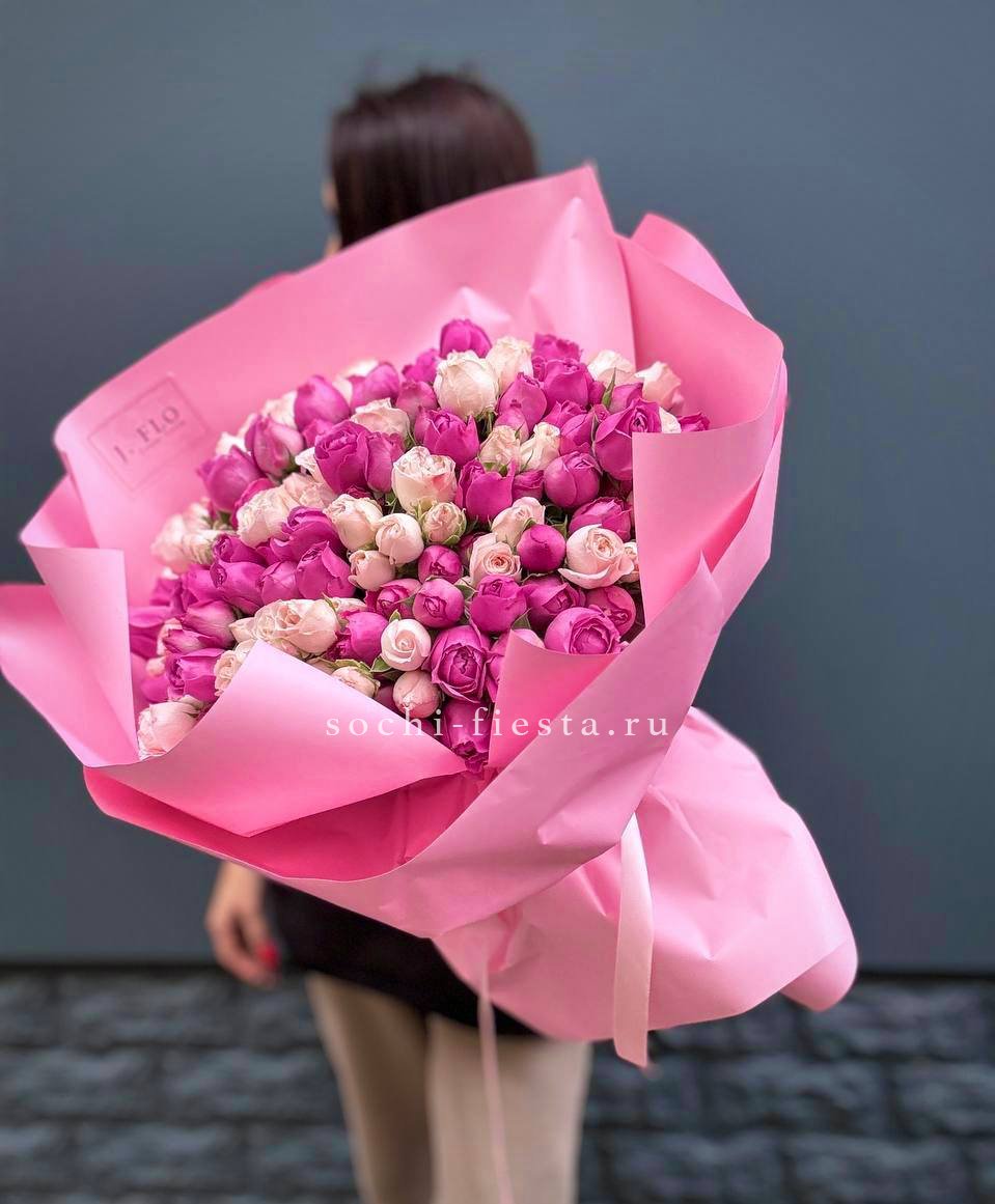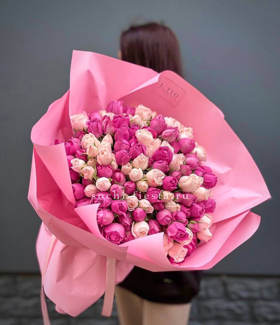 Сто один стебель кустовой розы собраны в плотный букет с множеством мелких бутонов. Каждая ветвь раскрывается пышной шапкой соцветий, создавая объёмную текстуру и живую динамику композиции.