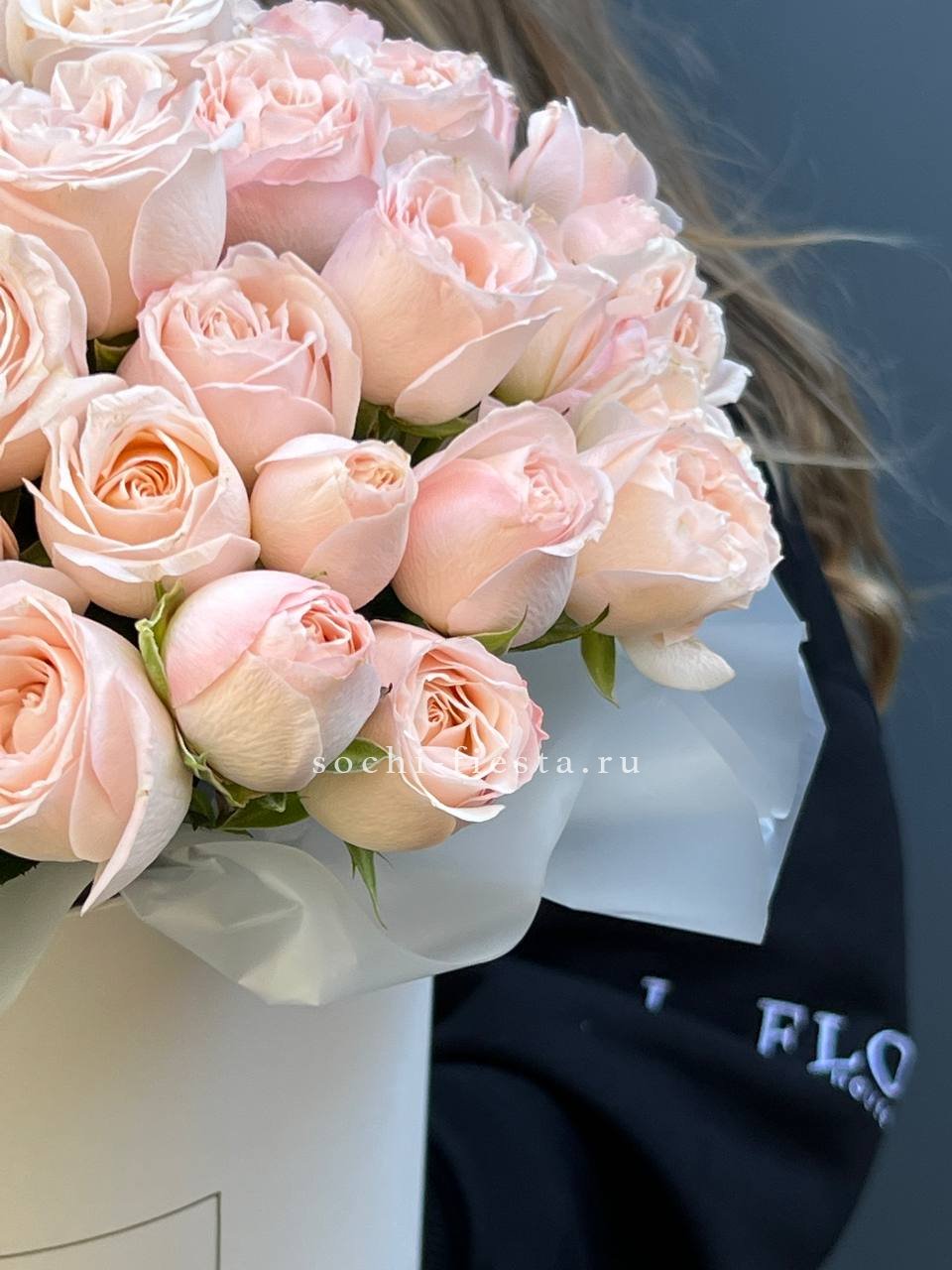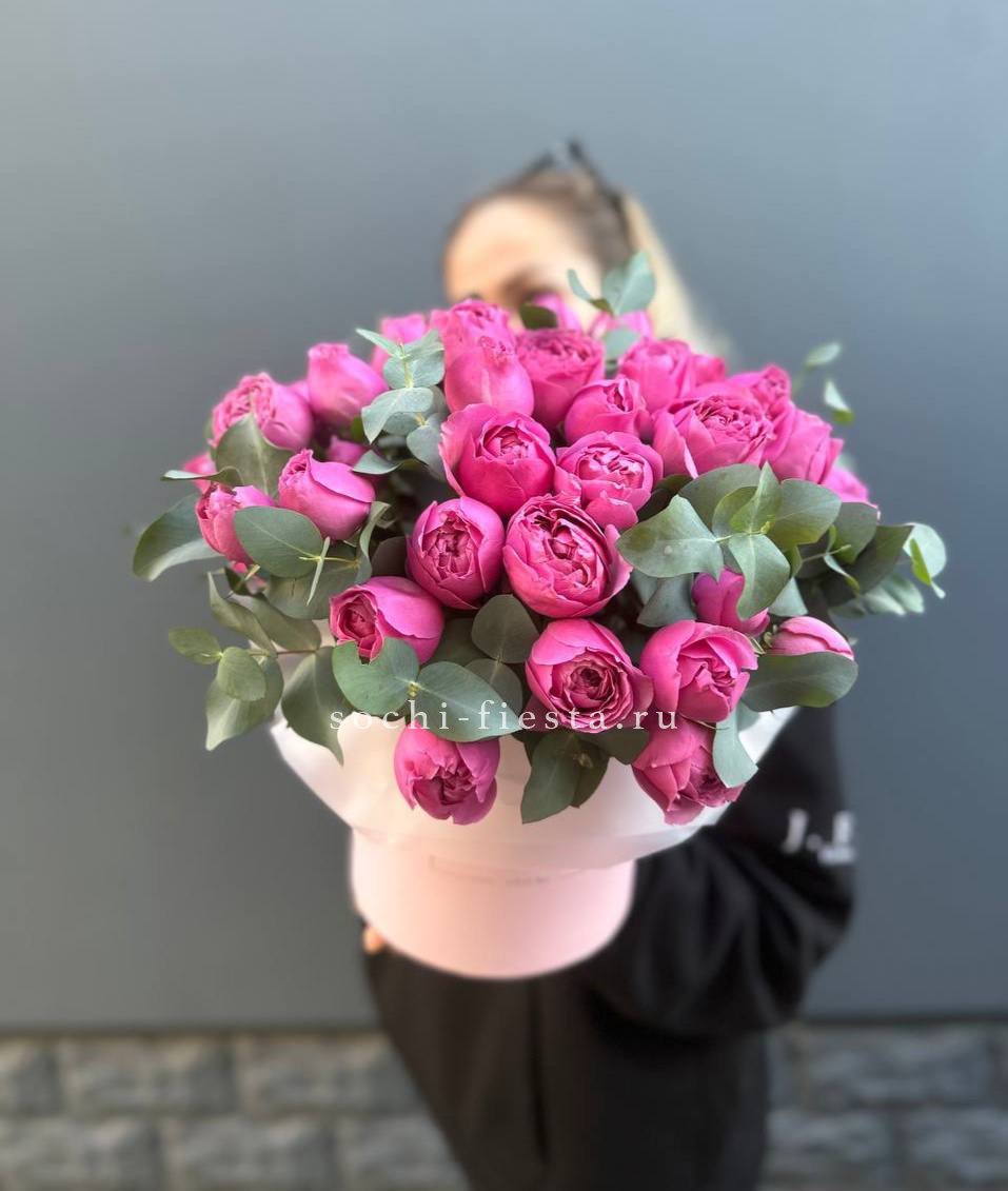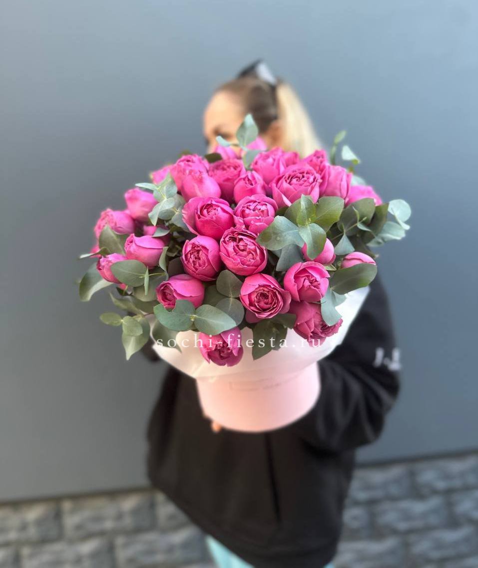 55 роз сорта Misty bubbles и bombastic, лента, дизайнерская упаковка.