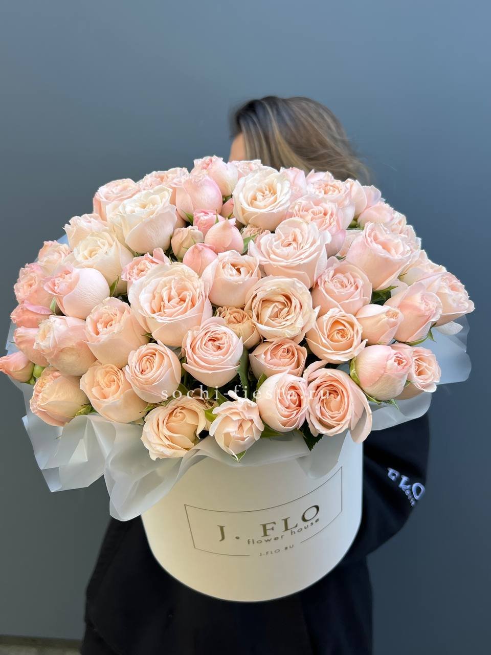 Пятьдесят пять роз двух сортов образуют монументальную композицию с выраженным присутствием в пространстве. Крупные бутоны создают плотную текстуру и заполняют объём без пустот. Впечатление масштаба и продуманной гармонии.