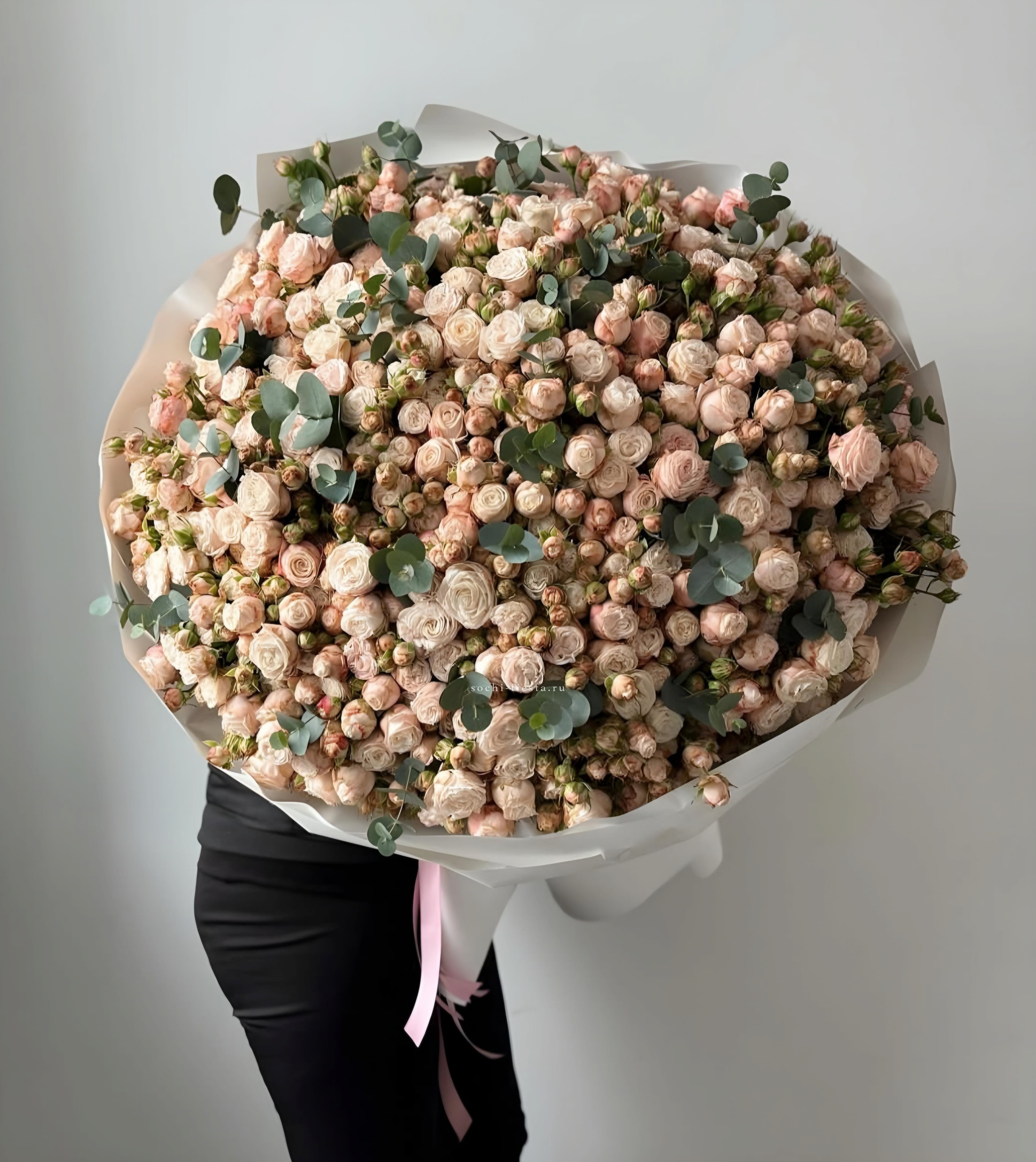 кустовая роза - 19 шт., эвкалипт, лента, дизайнерская упаковка.