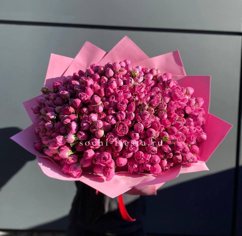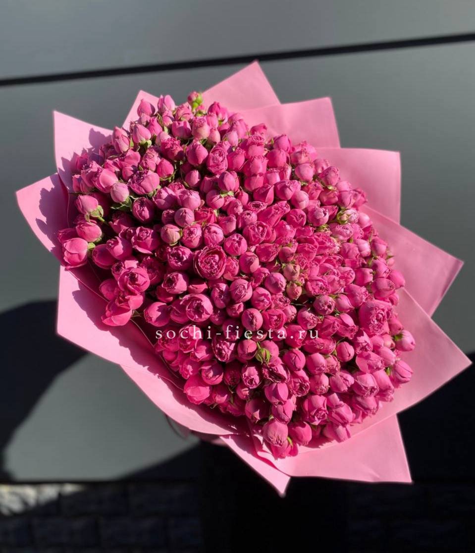 Спрей-розы раскрываются кустиками на гибких стеблях, образуя лёгкую живую структуру. Пятнадцать веток с множеством мелких бутонов придают букету естественную подвижность.