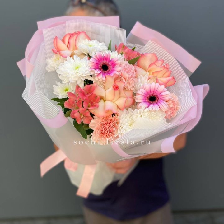 сборный букет из роз и хризантем для подарка в небольшом городе
