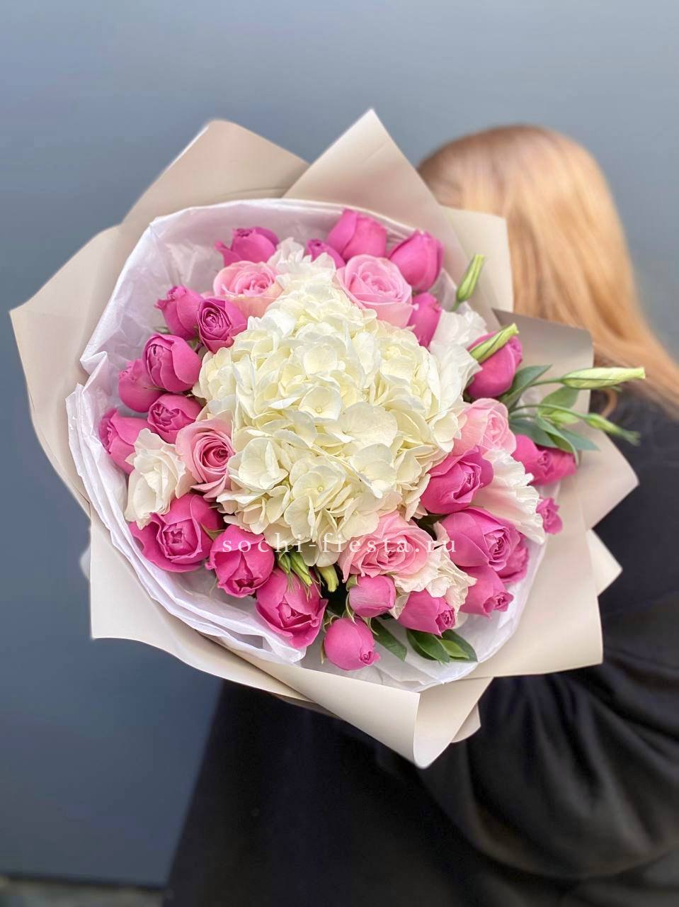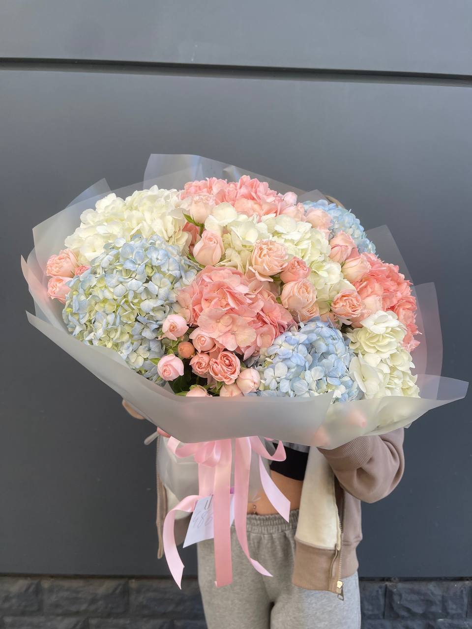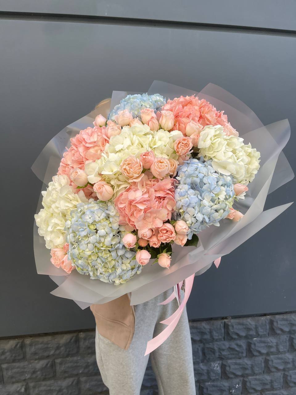 Плотная сборка с пышными соцветиями гортензии и яркими герберами создает объемный силуэт. Маттиола и лимониум добавляют воздушности по краям, а диантусы заполняют центр мягкими переходами.