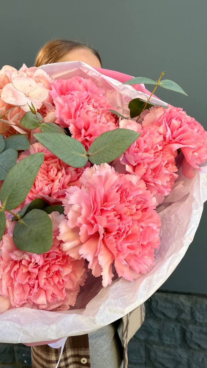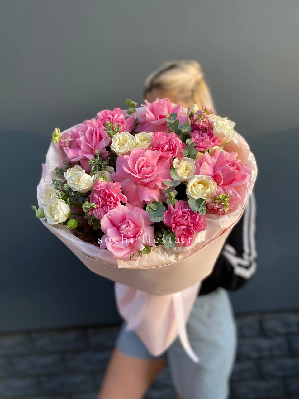 Розовые розы, пионовидная кустовая роза, эвкалипт,  лента, авторская упаковка.