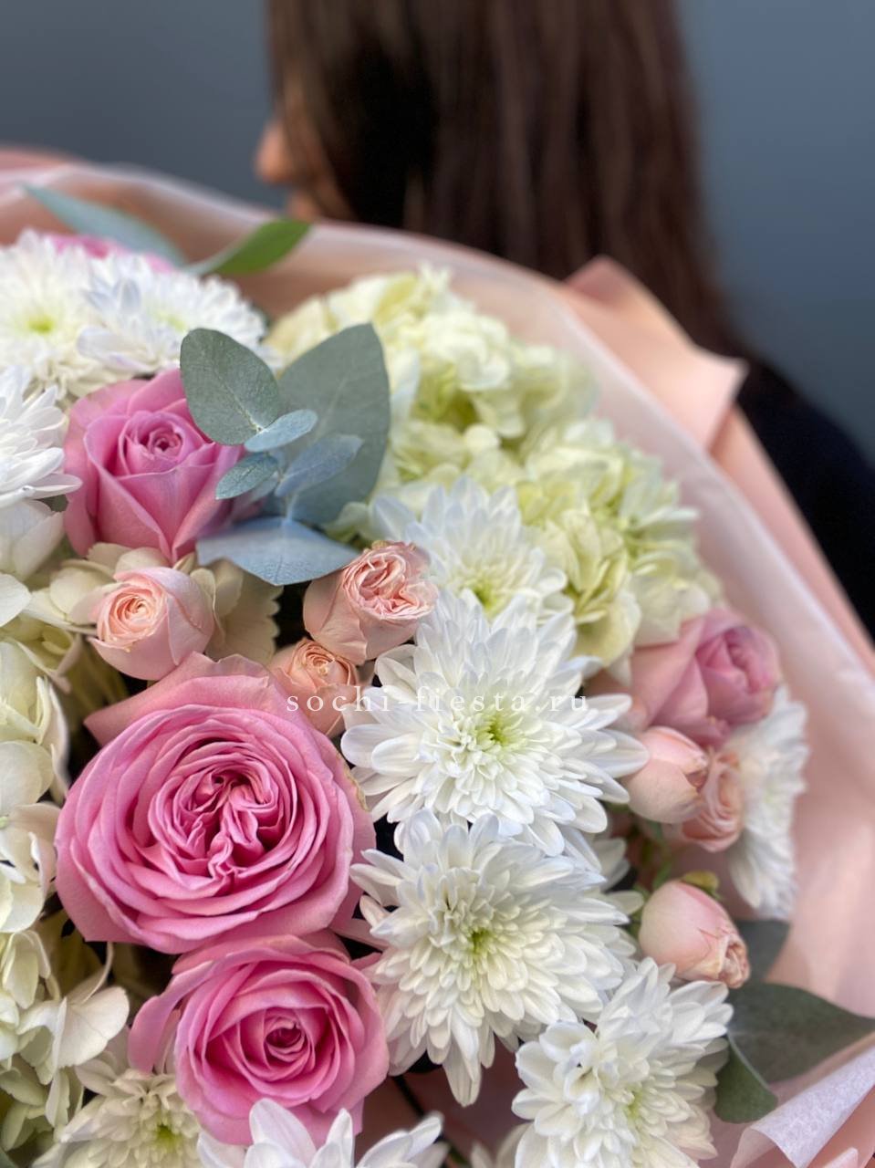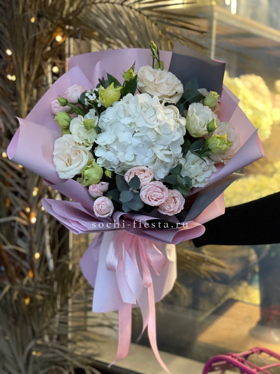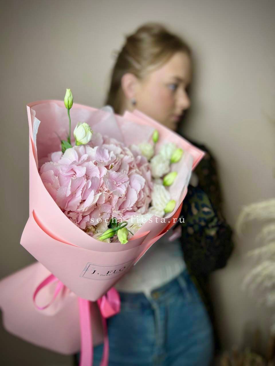 гортензия, эустома, диантус, мисти баблс, озотамус в нежном оформлении.