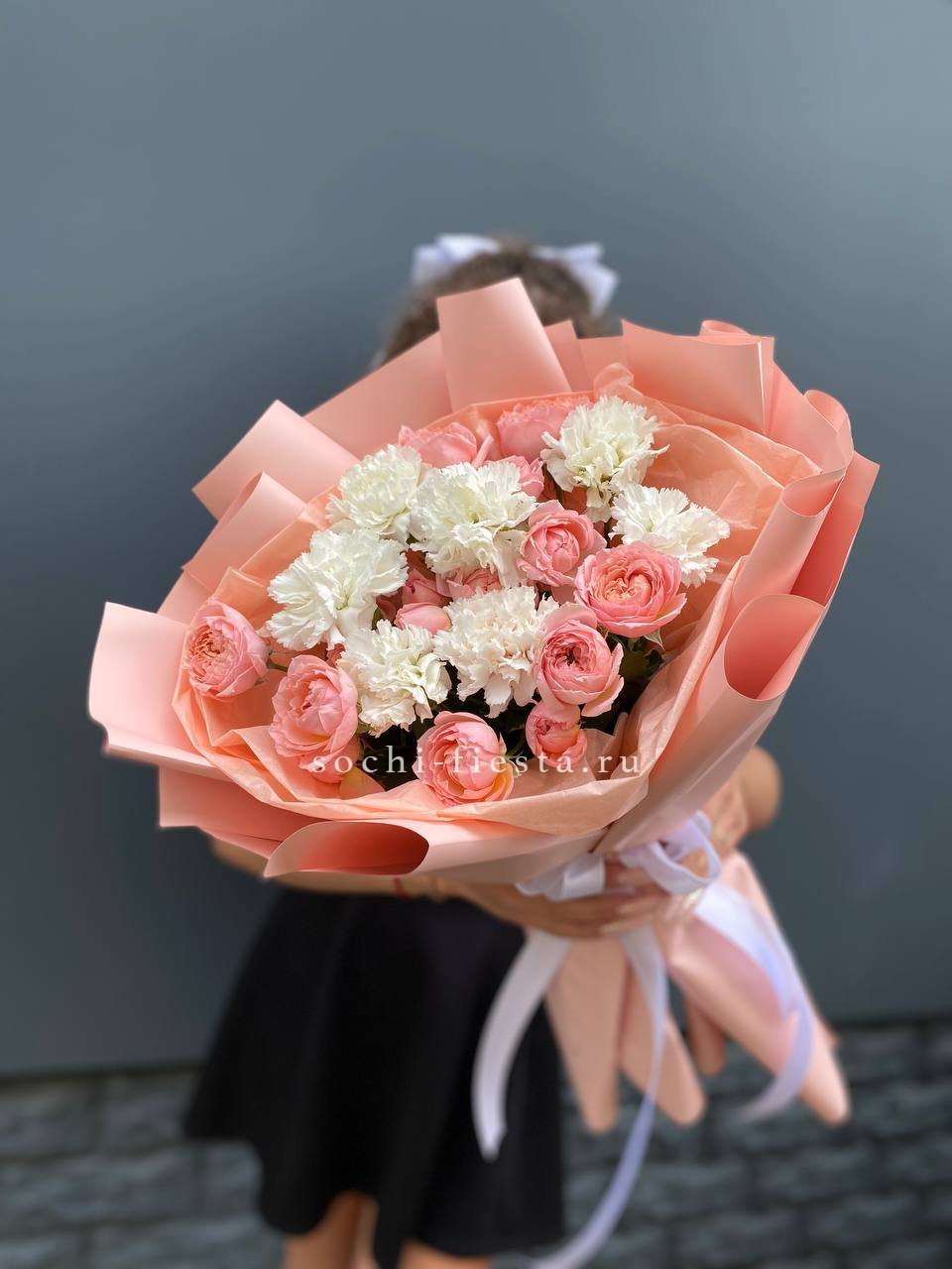 Пудровые кустовые розы Джульетта собраны в плотный круг вместе с яркими диантусами. Форма букета держится за счёт аккуратной обёртки и ленты. Композиция выглядит собранно и готова к вручению без дополнительной упаковки.