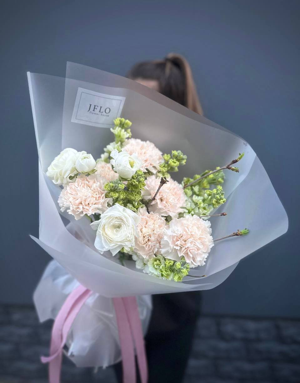 Душистая маттиола и многослойные ранункулюсы собраны в пышную композицию с цветущими ветками. Диантусы добавляют воздушности, а матовое оформление завершает образ.