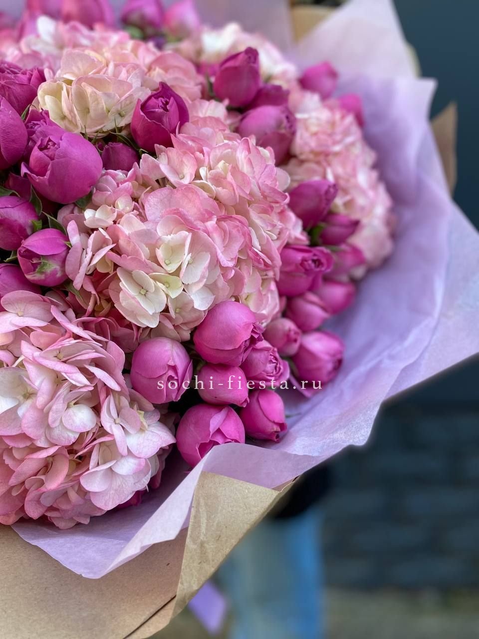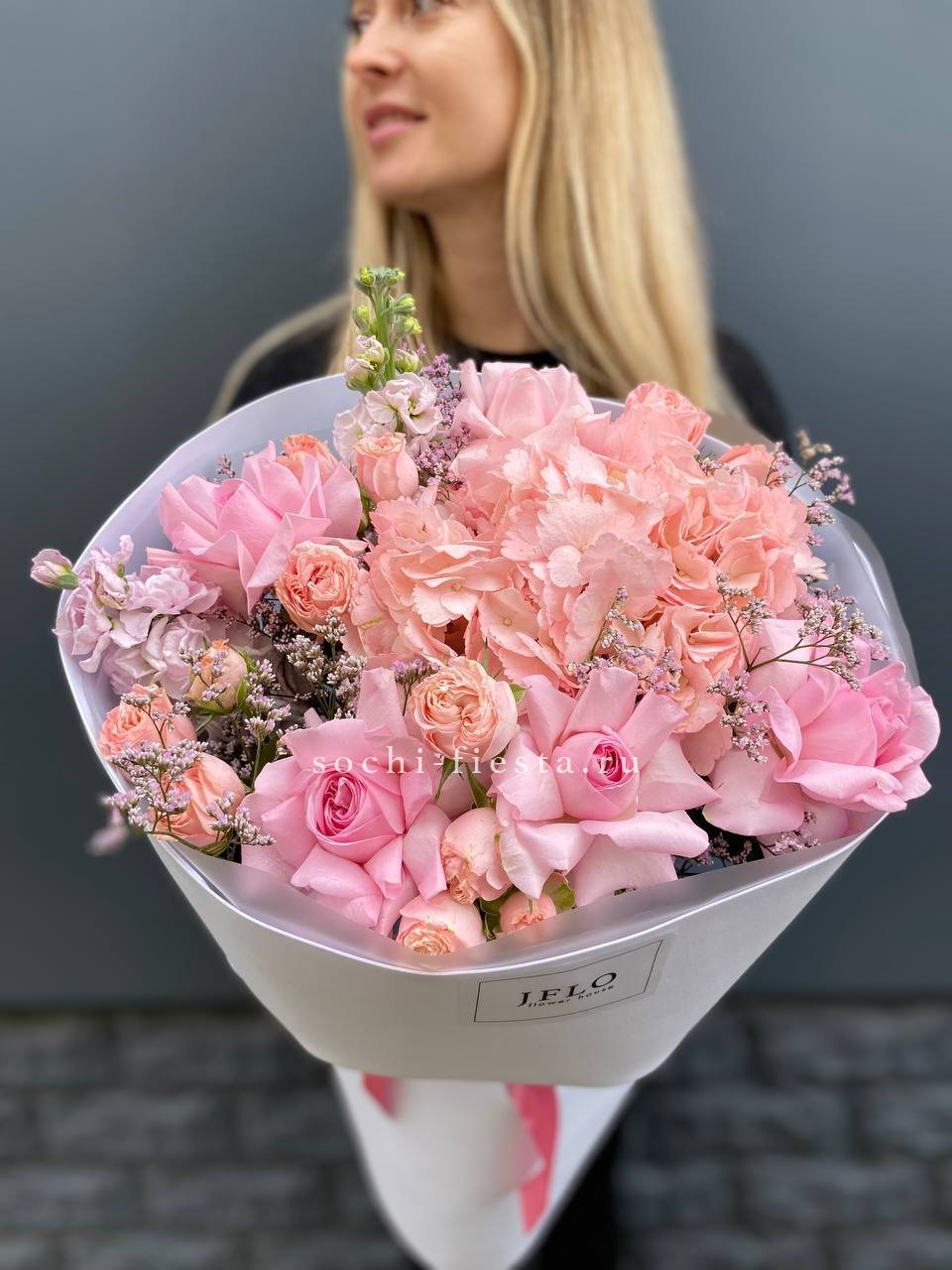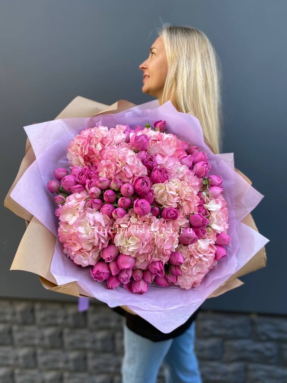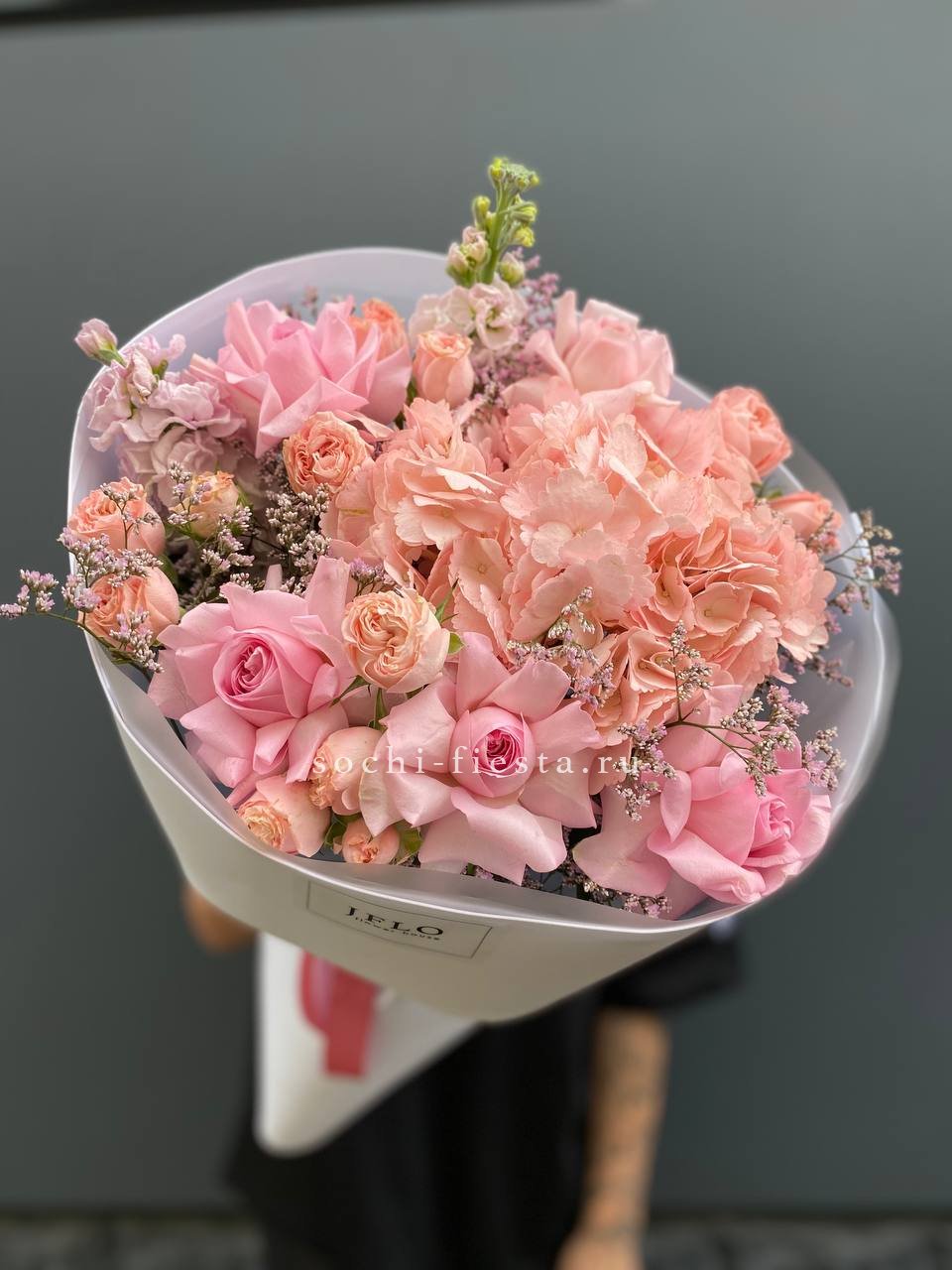 Воздушная композиция с крупными соцветиями гортензии и пышными розами создает ощущение легкости и объема. Эвкалипт добавляет свежести, а бомбастик расставляет яркие акценты между бутонами.