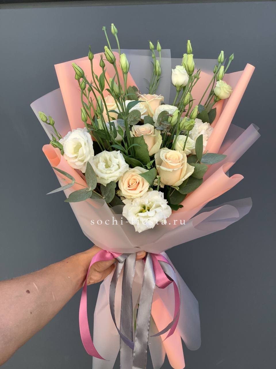 роза, эустома, эвкалипт, лента, дизайнерская упаковка.