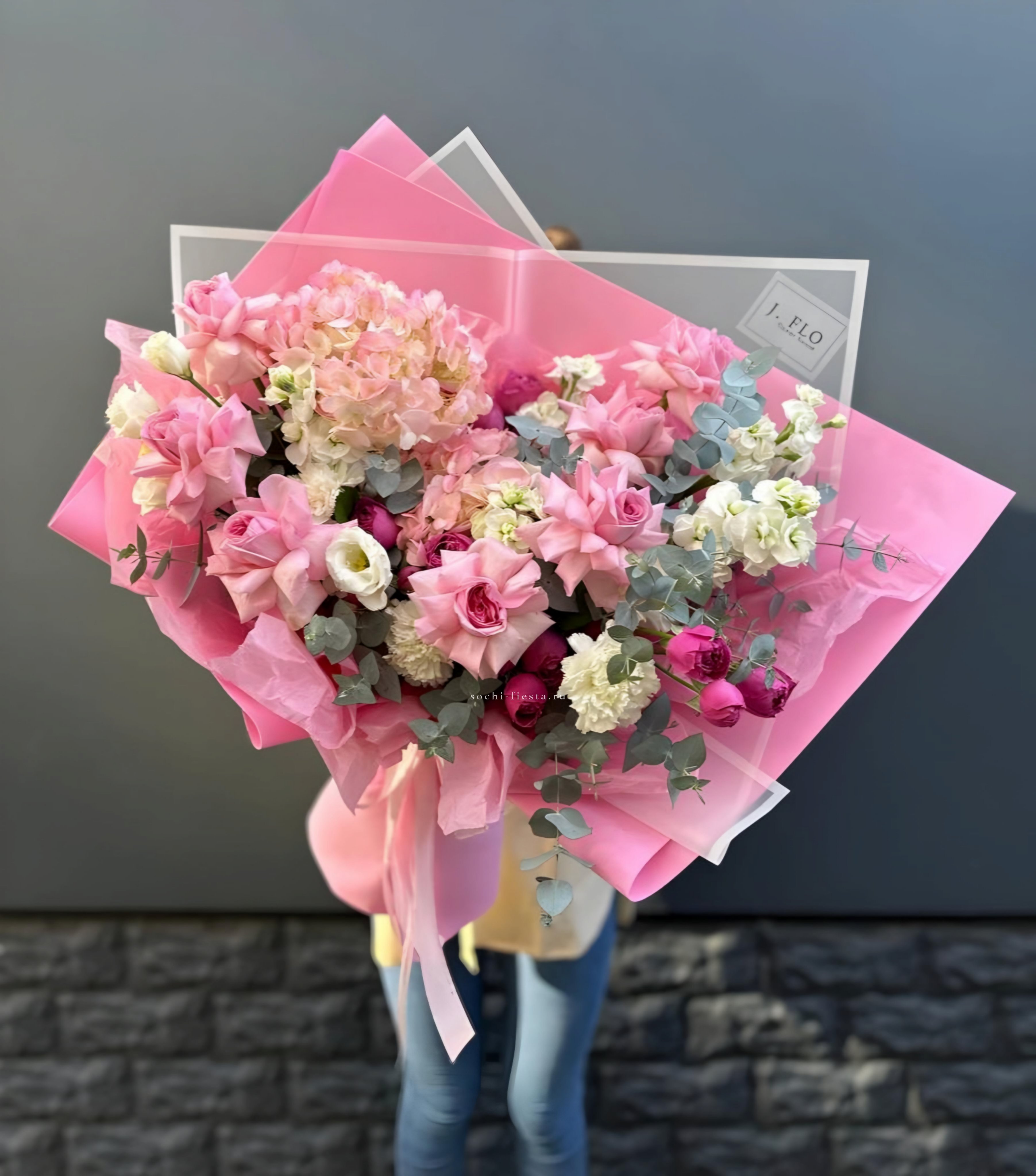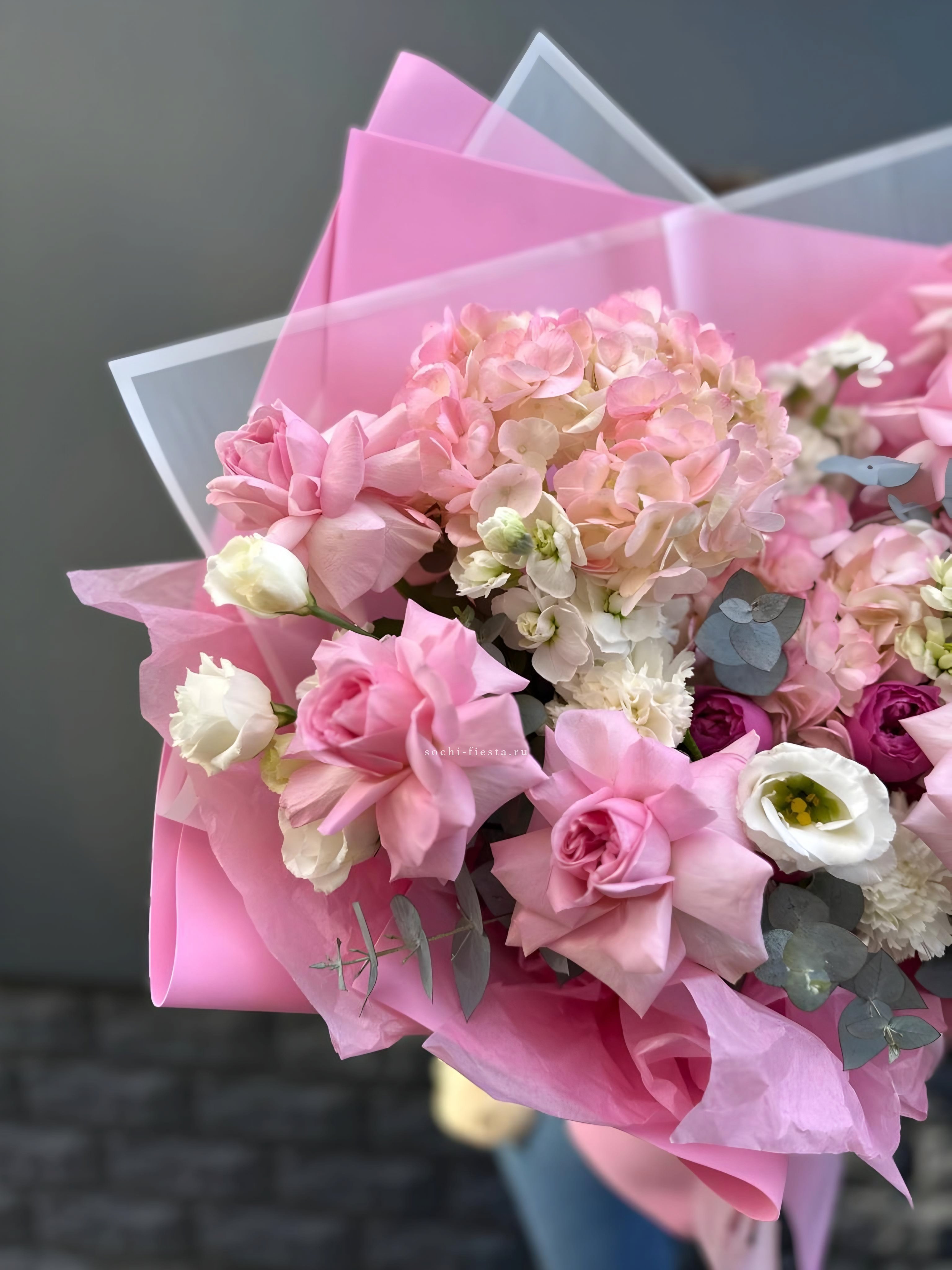 гортензия, французские розы, маттиола, лимониум, дианстусы, эвкалипт, ковыль и дизайнерская упаковка.