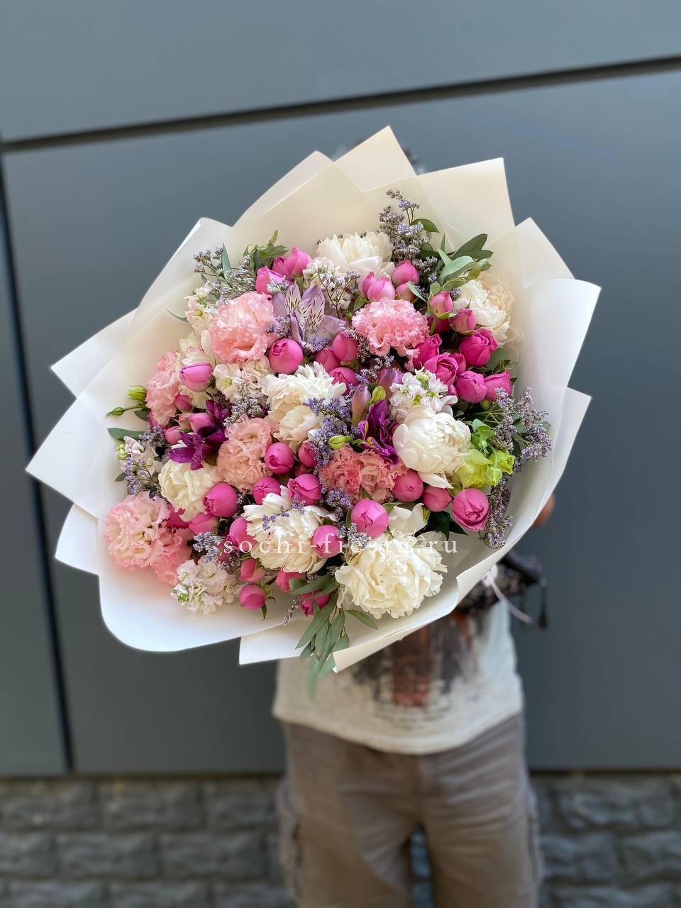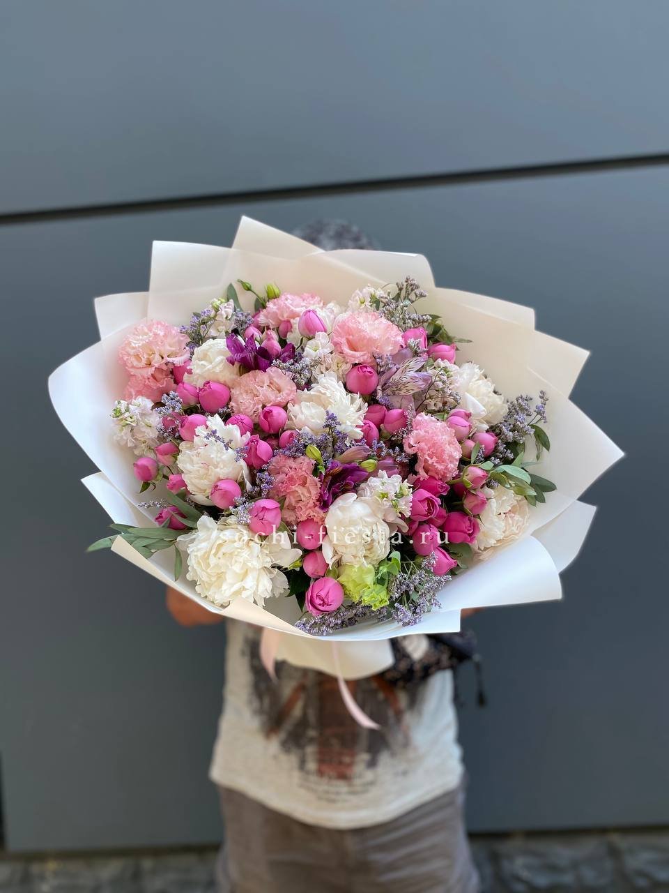 пионы (или аналог вне сезона), лимониум, маттиола, мисти баблс, эустома, эвкалипт, лента, упаковка.