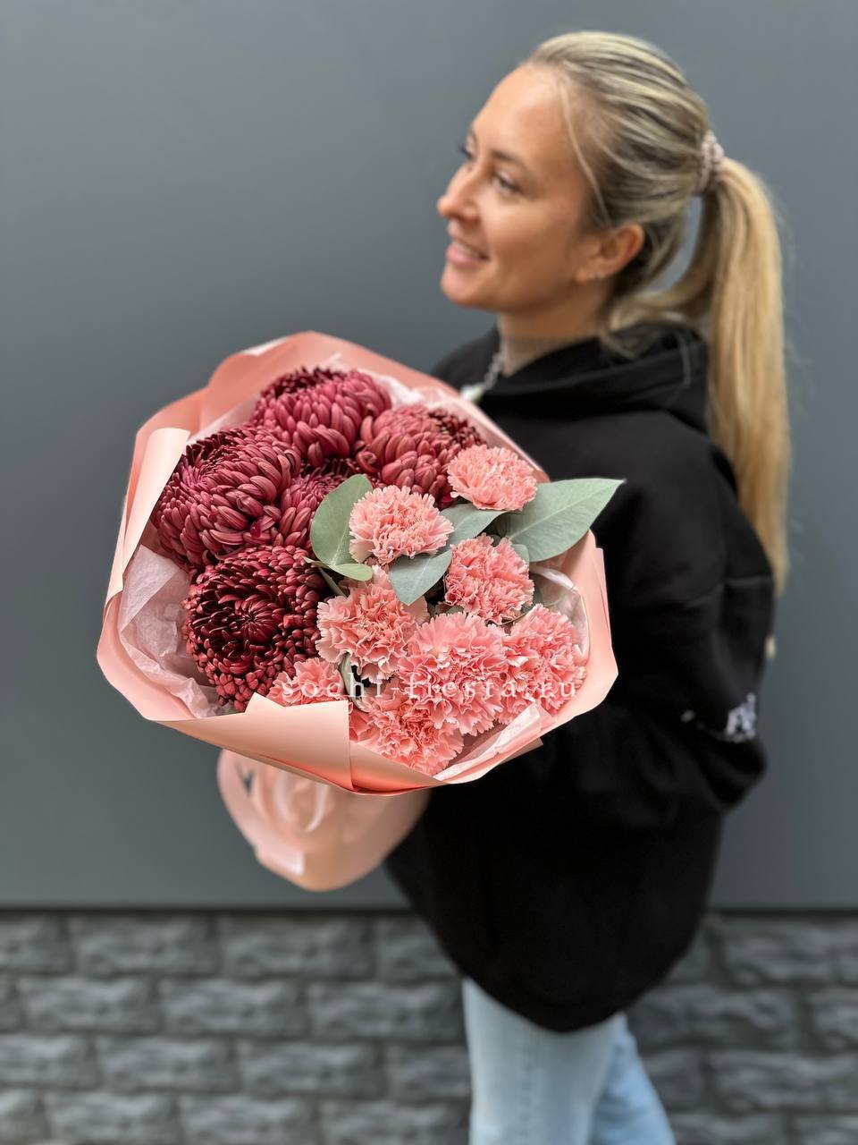 Диантусы и бигуди собраны в плотную форму с чёткими линиями. Эвкалипт задаёт вертикальный ритм и добавляет свежести. Композиция выглядит графично и современно.