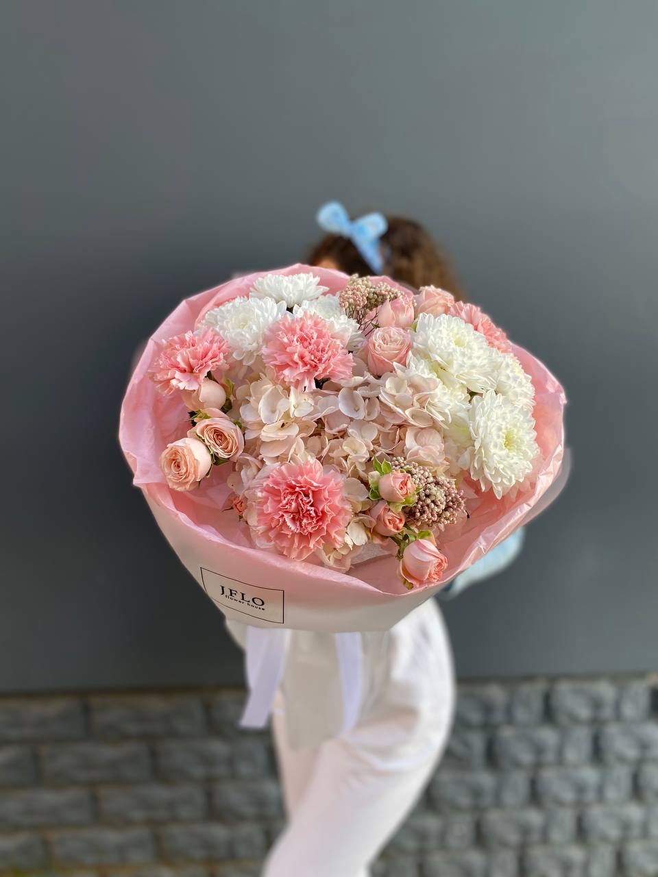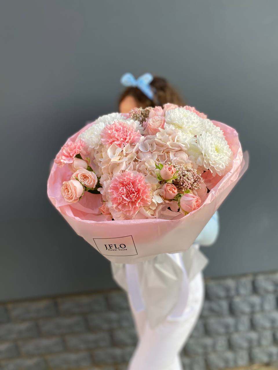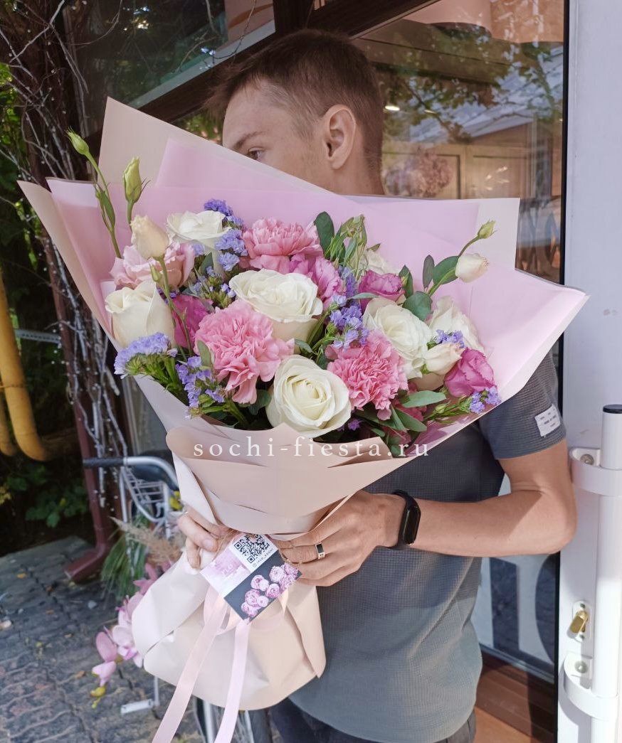 гортензия, гвоздика, статица (или аналог), роза, эустома, дизайнерская пленка, лента.