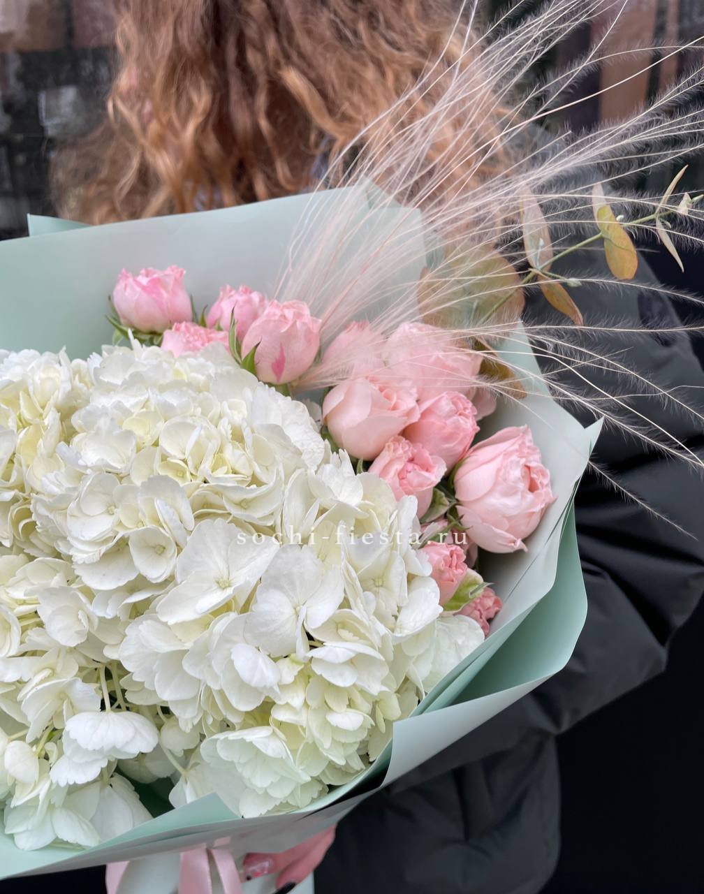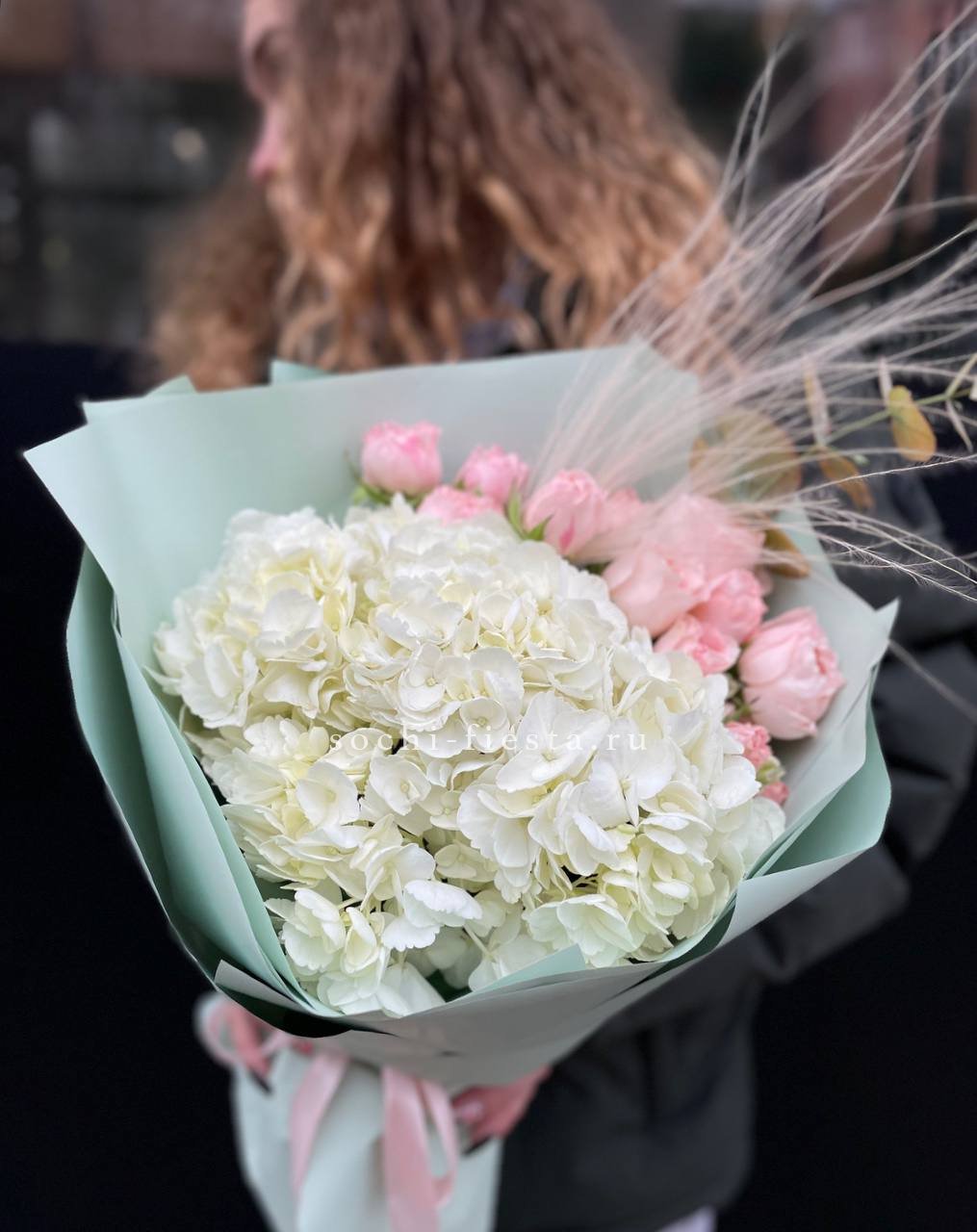 Кремовые розы окружены облаками гортензии, а эустома расставляет светлые акценты по краям. Букет держит форму и при этом выглядит объемно благодаря многослойной сборке.