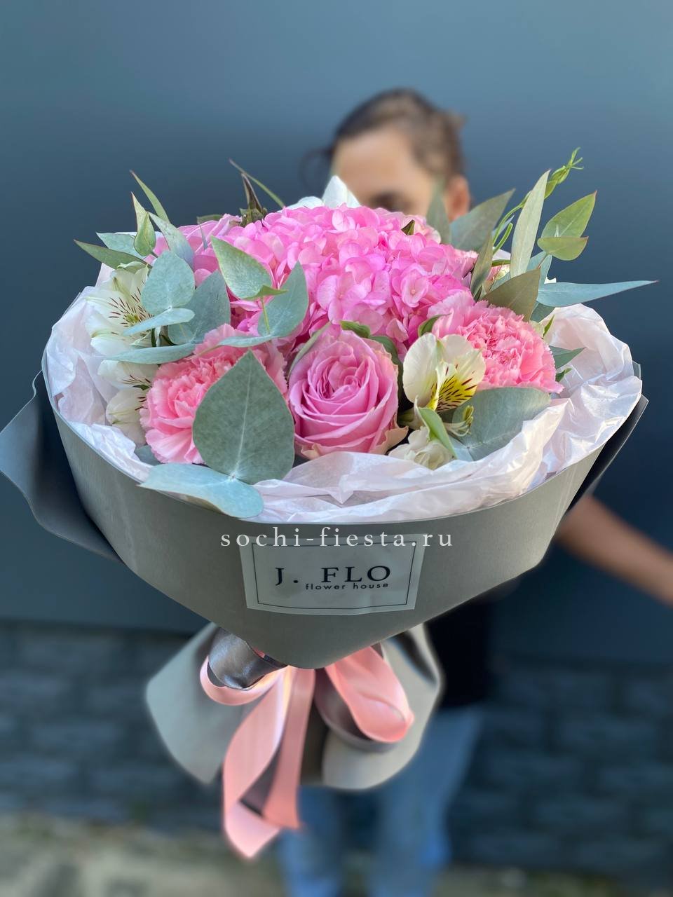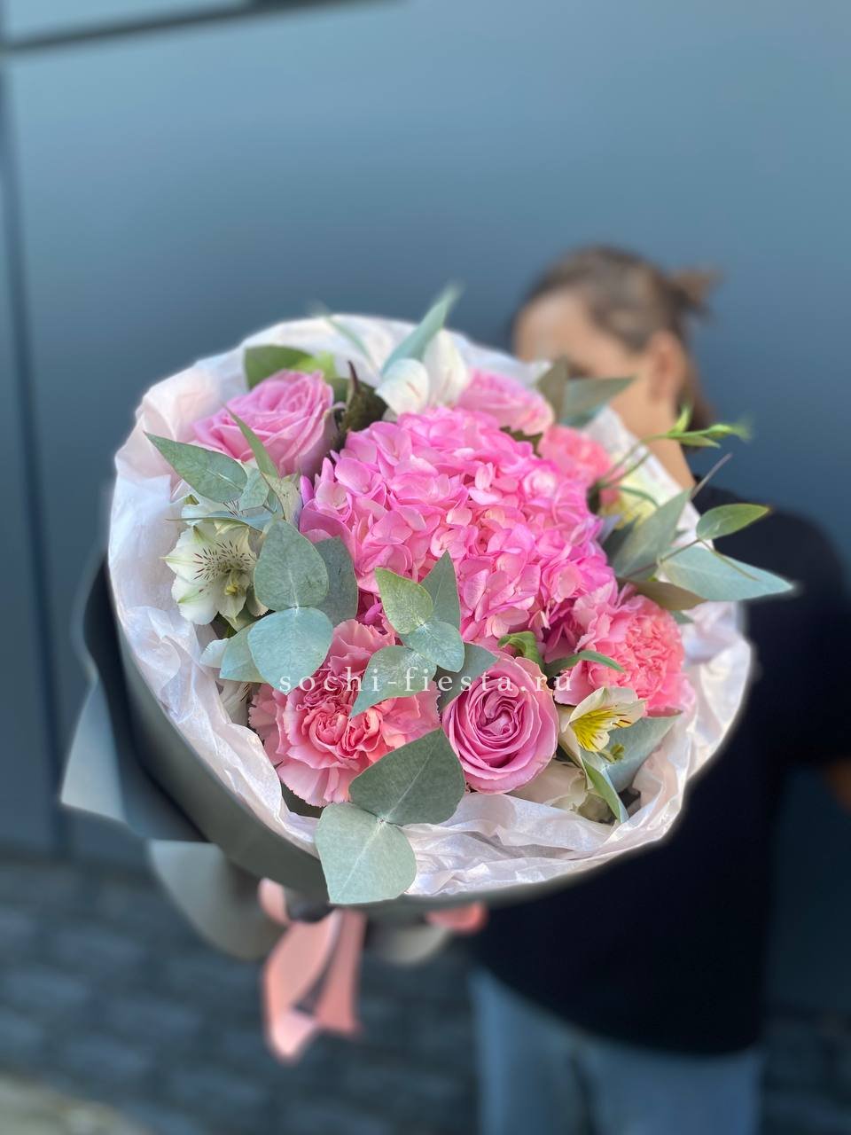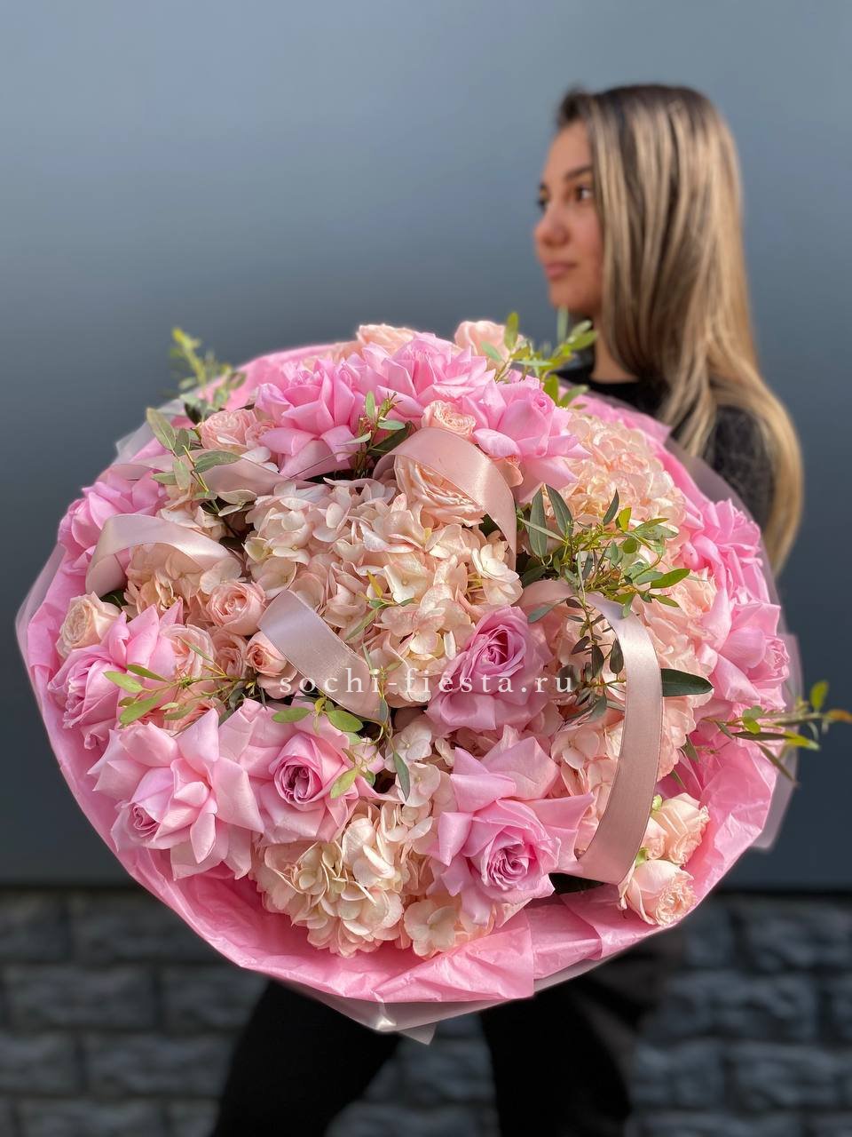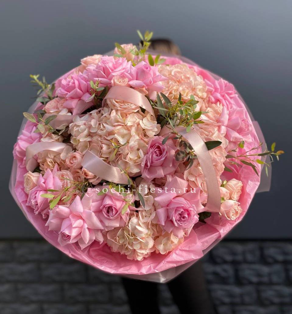 гортензия, эустома, кустовые розы, одноголовые розы, эвкалипт, вспомогательная зелень.