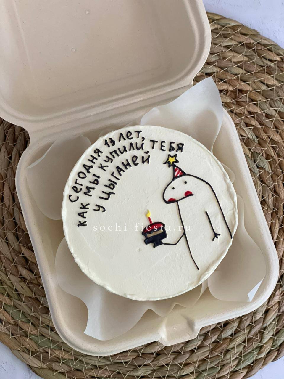 Юмор в съедобной форме — это когда крем уложен ровно, а надпись заставляет улыбнуться. Небольшой формат помещается в ладонях и легко становится центром стола. Выбор из двух начинок добавляет интригу.